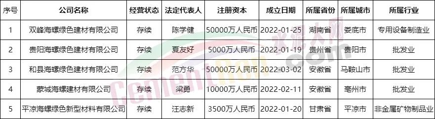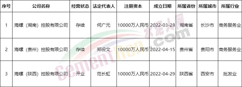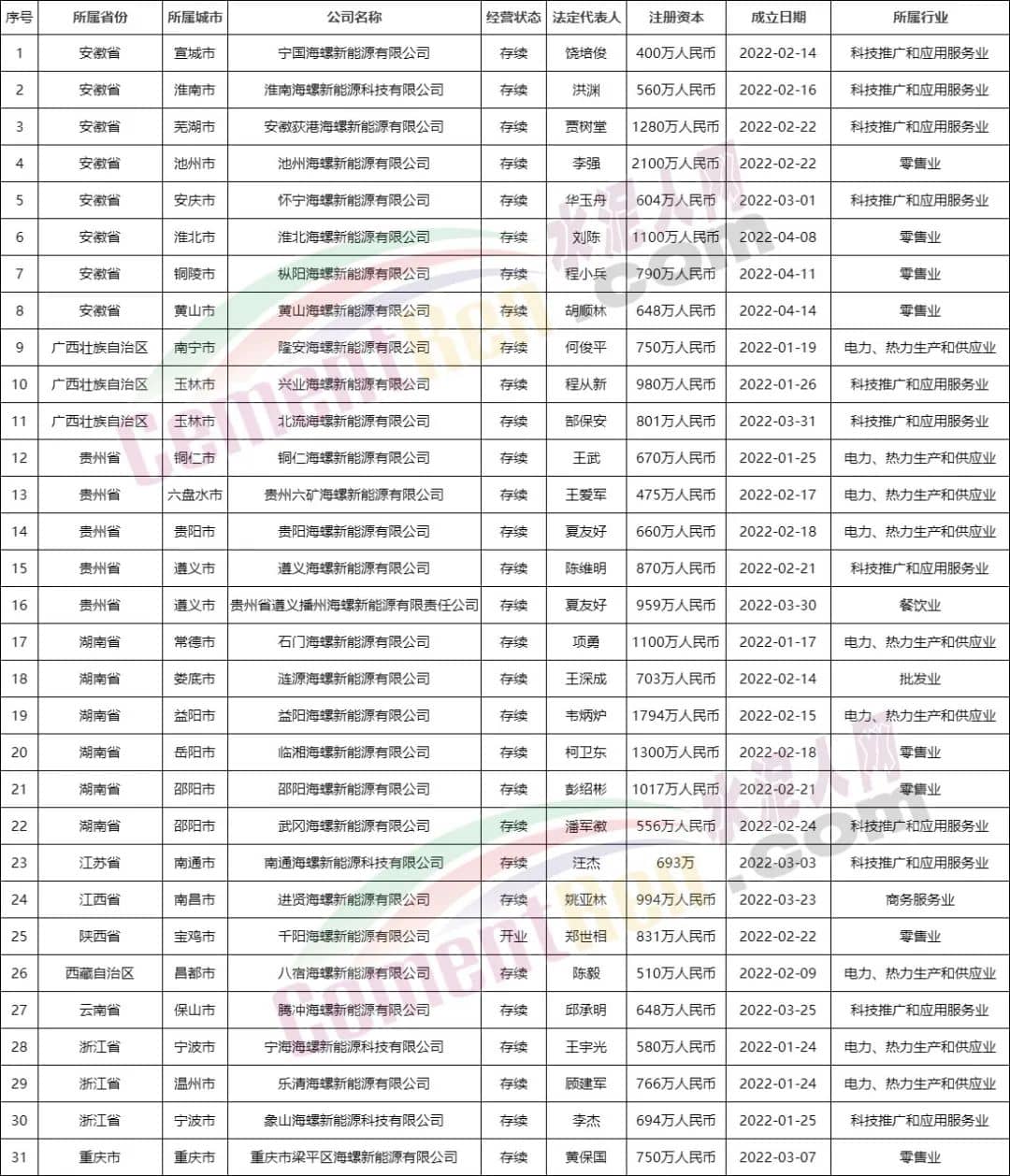 據(jù)水泥人網(wǎng)信息中心數(shù)據(jù),今年以來海螺水泥以“海螺新能源”為企業(yè)名稱注冊的企業(yè)達31家,以“海螺綠色建材”為名稱的企業(yè)5家,以“海螺控股有限公司”為名稱的區(qū)域企業(yè)3家,以“海螺光伏科技”為企業(yè)名稱的企業(yè)兩家。詳情如下:
