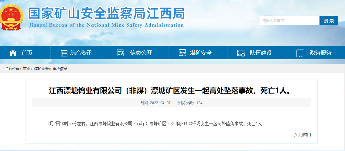 江西漂塘鎢業(yè)突發(fā)高墜事故,1人死亡