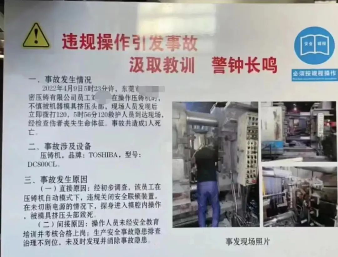 11.東莞市某精密壓鑄有限公司一員工不慎被機(jī)器模具擠壓頭部,經(jīng)搶救無效死亡。