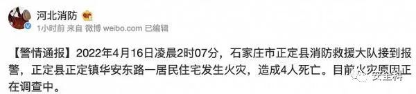 4月16日凌晨2時07分,石家莊市正定縣消防救援大隊接到報警,正定縣正定鎮(zhèn)華安東路一居民住宅發(fā)生火災(zāi),造成4人死亡。