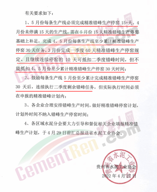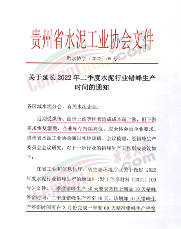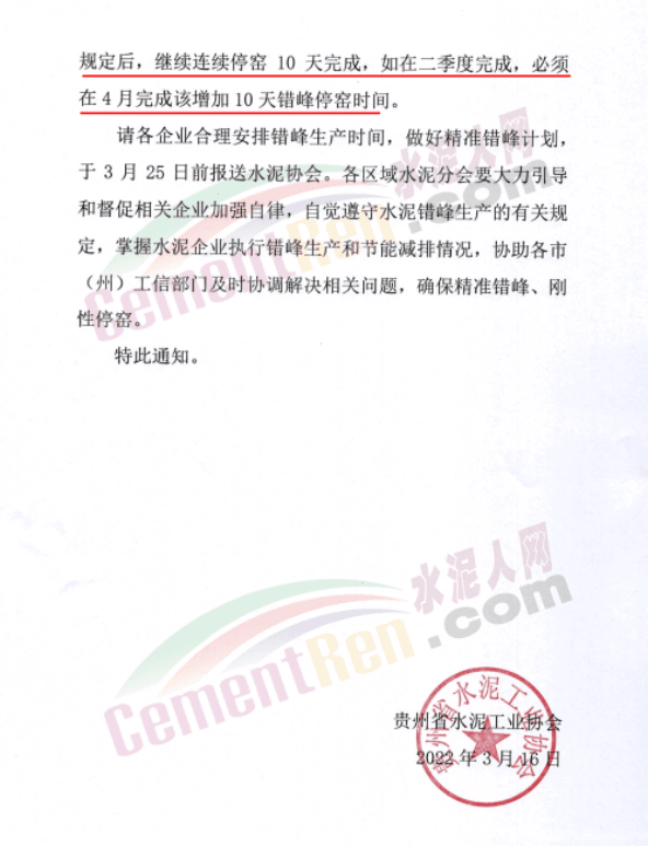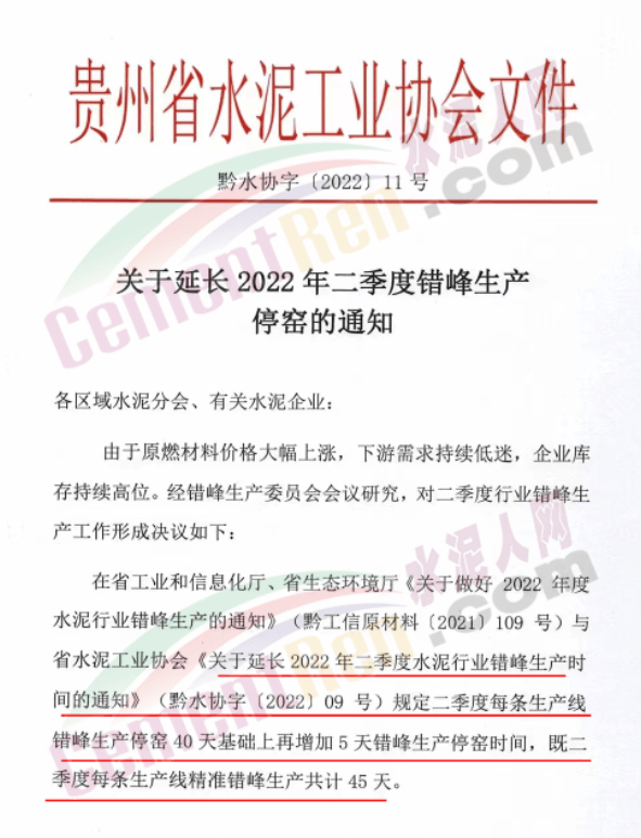 在貴州省工業(yè)和信息化廳、省生態(tài)環(huán)境廳《關(guān)于做好2022年度水泥行業(yè)錯峰生產(chǎn)的通知》與省水泥工業(yè)協(xié)會《關(guān)于延長2022年二季度水泥行業(yè)錯峰生產(chǎn)時間的通知》規(guī)定二季度每條生產(chǎn)線錯峰生產(chǎn)停窯40天基礎(chǔ)上再增加5天錯峰生產(chǎn)停窯時間,既二季度每條生產(chǎn)線精準錯峰生產(chǎn)共計45天。有關(guān)要求如下∶