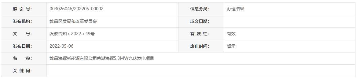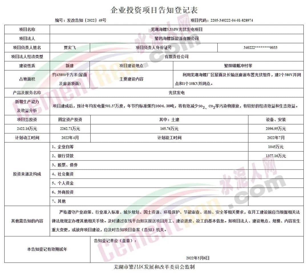 天眼查資料顯示,繁昌海螺新能源有限公司成立于2020年12月,主要經營光伏、風電及儲能領域的技術開發(fā)、服務和項目建設運營管理等,是安徽海螺新能源有限公司全資子公司。