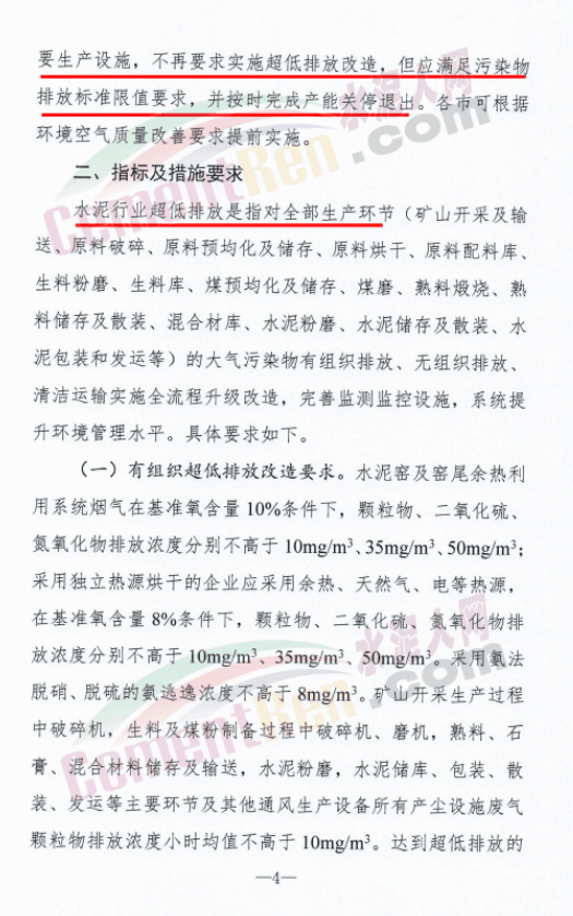 水泥行業(yè)超低排放是指對全部生產(chǎn)環(huán)節(jié)(礦山開采及輸送、原料破碎、原料預(yù)均化及儲存、原料烘干、原料配料庫、生料粉磨、生料庫、煤預(yù)均化及儲存、煤磨、熟料煅燒、熟料儲存及散裝、混合材庫、水泥粉磨、水泥儲存及散裝、水泥包裝和發(fā)運(yùn)等)的大氣污染物有組織排放、無組織排放、清潔運(yùn)輸實施全流程升級改造,完善監(jiān)測監(jiān)控設(shè)施,系統(tǒng)提升環(huán)境管理水平。具體要求如下: