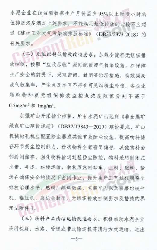 達(dá)到超低排放的水泥企業(yè)在線監(jiān)測數(shù)據(jù)生產(chǎn)月份至少95%以上時段小時均值排放濃度滿足上述要求,不能滿足超低排放的時段不應(yīng)超過《建材工業(yè)大氣污染物排放標(biāo)準(zhǔn)》DB37/2373-2018)的有關(guān)要求。