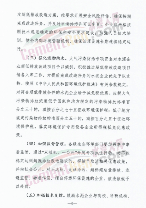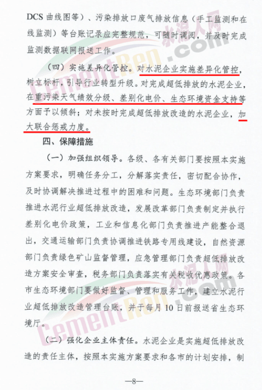對完成超低排放的水泥企業(yè),在重污染天氣績效分級、差別化電價、生態(tài)環(huán)境資金支持等方面予以傾斜;對未按時完成超低排放改造的水泥企業(yè),加大聯(lián)合懲戒力度。