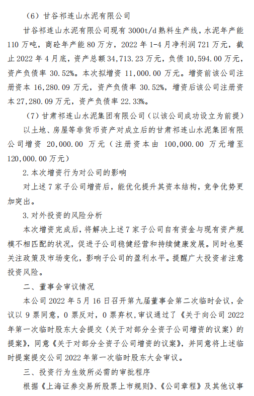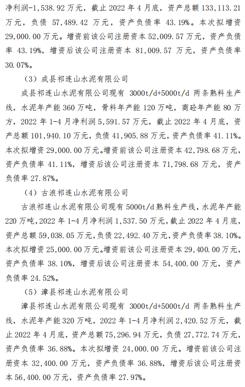 公司擬對7家子公司進行增資,分別為青海祁連山水泥有限公司、永登祁連山水泥有限公司、成縣祁連山水泥有限公司、古浪祁連山水泥有限公司、漳縣祁連山水泥有限公司、甘谷祁連山水泥有限公司、甘肅祁連山水泥集團有限公司(以該公司成功設立為前提)。向上述全資子公司合計增資17.3億元。公告原文如下: