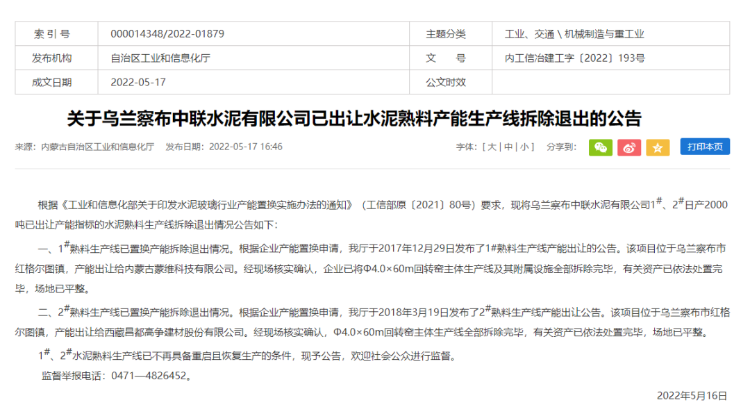 5月16日,內(nèi)蒙古自治區(qū)工信廳發(fā)布《關(guān)于烏蘭察布中聯(lián)水泥有限公司已出讓水泥熟料產(chǎn)能生產(chǎn)線拆除退出的公告》稱,烏蘭察布中聯(lián)水泥有限公司1#、2#日產(chǎn)2000噸已出讓產(chǎn)能指標(biāo)的水泥熟料生產(chǎn)已不再具備重啟且恢復(fù)生產(chǎn)的條件。