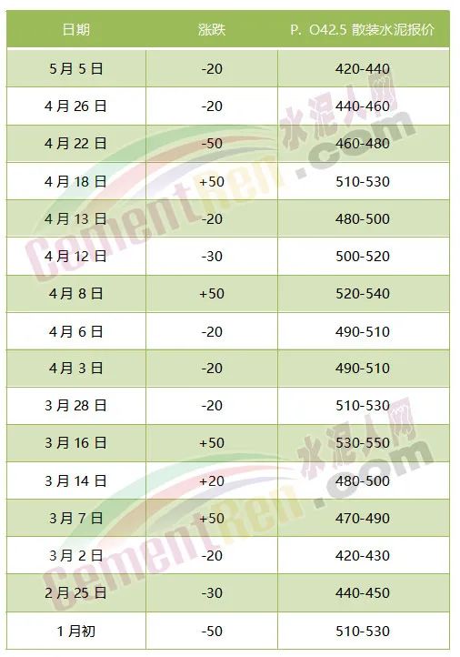 備注:以上報(bào)價(jià)為單位元/噸,數(shù)據(jù)來源水泥人網(wǎng)信息中心人工采集,僅供參考,如與實(shí)際成交不符,請(qǐng)以實(shí)際成交為準(zhǔn)。