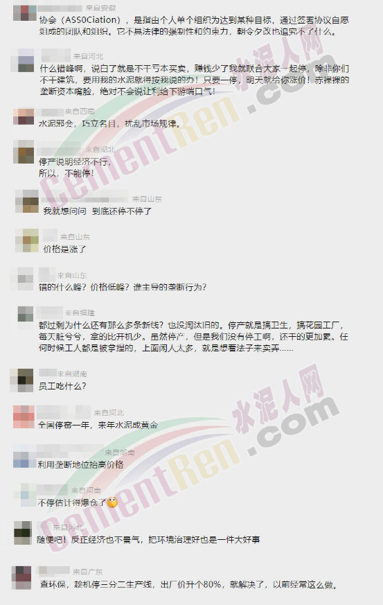 某水泥企業(yè)生產(chǎn)負(fù)責(zé)人表示,暫未收到集團(tuán)公司的通知,目前還不知道是停還是不停。按原定計(jì)劃是要停的,但是看媒體報(bào)道說協(xié)會(huì)又不讓停了。