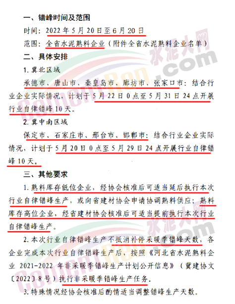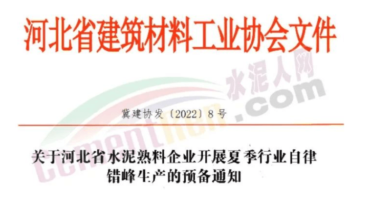 河北省建筑材料工業(yè)協(xié)會(huì)發(fā)布關(guān)于《河北省水泥熟料企業(yè)開展夏季行業(yè)自律錯(cuò)峰生產(chǎn)的通知》,通知要求分區(qū)域,5月20至6月10日,分區(qū)域每個(gè)企業(yè)最少停產(chǎn)10天。