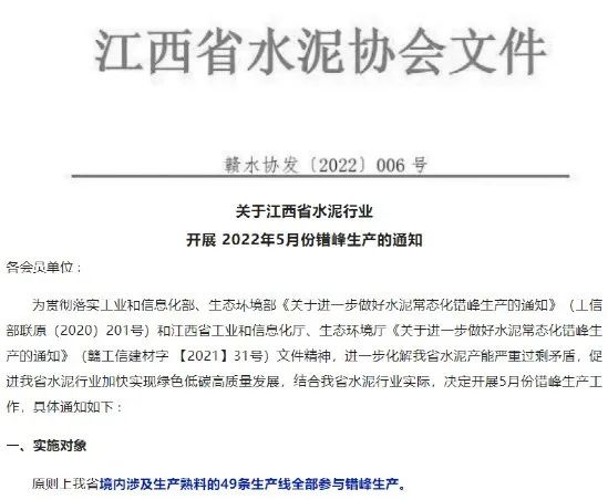 江西省發(fā)布關(guān)于水泥行業(yè)開展2022年5月份錯(cuò)峰生產(chǎn)的通知,要求江西省境內(nèi)49條水泥熟料生產(chǎn)線5月10日00:00-5月19日24:00.錯(cuò)峰生產(chǎn)10天。