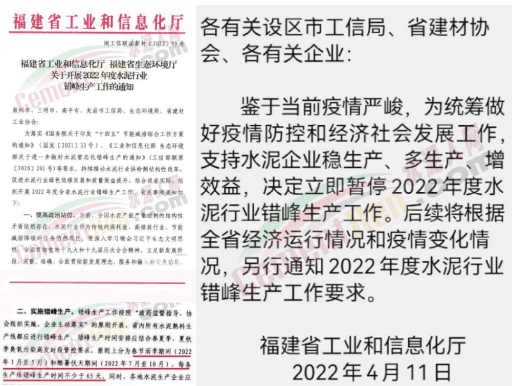 福建省與山東省類似,也是先發(fā)了錯(cuò)峰生產(chǎn)文件又通知暫停通知。福建省工信廳和福建省生態(tài)環(huán)境廳3月17日聯(lián)合發(fā)布通知要求省內(nèi)所有水泥熟料生產(chǎn)線酷暑伏天期間(2022年7月至10月),每條生產(chǎn)線錯(cuò)峰生產(chǎn)時(shí)間不少于65天。4月11日工信廳又通知為了支持水泥企業(yè)穩(wěn)生產(chǎn)、多生產(chǎn),增效益暫停錯(cuò)峰。