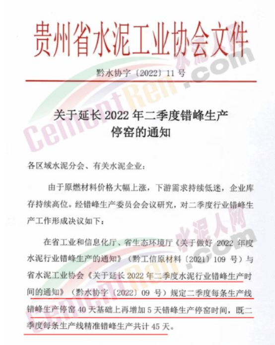 貴州省水泥工業(yè)協(xié)會(huì)發(fā)布通知稱,因原燃材料價(jià)格上漲,下游需求低迷,企業(yè)庫存持續(xù)高位,經(jīng)研究決定延長錯(cuò)峰。要求貴州區(qū)域所有水泥熟料生產(chǎn)線二季度每條生產(chǎn)線精準(zhǔn)錯(cuò)峰生產(chǎn)45天。
