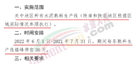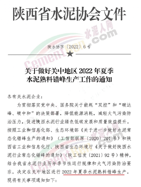 4月29日,陜西省水泥協(xié)會(huì)發(fā)布關(guān)于做好關(guān)中地區(qū)2022年夏季水泥熟料錯(cuò)峰生產(chǎn)工作的通知,要求關(guān)中地區(qū)所有水泥熟料生產(chǎn)線于2022年6月1日至7月31日期間錯(cuò)峰停窯30天/線。