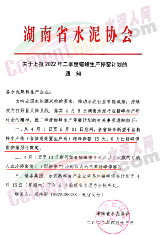 4月13日,湖南省水泥協(xié)會(huì)就發(fā)布《關(guān)于上報(bào)2022年二季度錯(cuò)峰生產(chǎn)停窯計(jì)劃的通知》,其中就有提到湖南省水泥熟料生產(chǎn)線自4月1日至5月31日期間,錯(cuò)峰停窯15天。