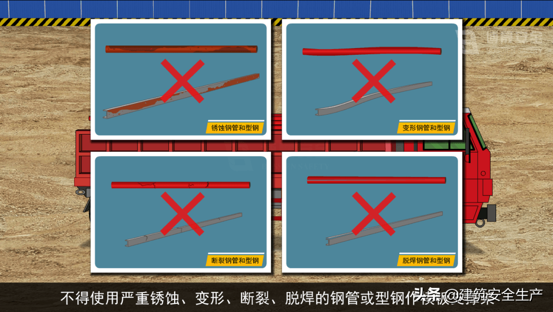 2.模板支撐架構(gòu)配件進場應(yīng)進行驗收,構(gòu)配件及材質(zhì)應(yīng)符合專項施工方案及相關(guān)標(biāo)準(zhǔn)的規(guī)定。不得使用嚴重銹蝕、變形、斷裂、脫焊的鋼管或型鋼做模板支撐架。嚴禁使用竹、木材和剛才混搭的結(jié)構(gòu)。所采用的構(gòu)件應(yīng)進行復(fù)試。