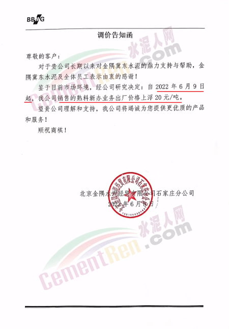 日前,北京金隅水泥經(jīng)貿(mào)有限公司石家莊分公司通知,鑒于目前市場環(huán)境,公司銷售的熟料新辦業(yè)務出廠價格上浮20元/噸。