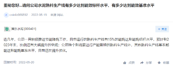 冀東水泥回復(fù)投資者時(shí)稱(chēng),近幾年,公司一直積極推進(jìn)節(jié)能降耗工作,目前運(yùn)行的熟料生產(chǎn)線(xiàn)有15%的能耗達(dá)到能耗標(biāo)桿水平,預(yù)計(jì)到2023年末,比例還有大幅提升的空間;公司除個(gè)別將要進(jìn)行產(chǎn)能置換的熟料生產(chǎn)線(xiàn)外,其他熟料生產(chǎn)線(xiàn)基本都能達(dá)到能耗基準(zhǔn)水平,目前還在提升優(yōu)化。
