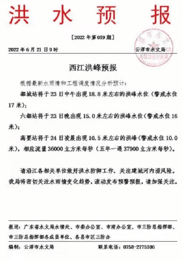 云浮市水文局發(fā)《洪水預(yù)報》稱, 根據(jù)最新水雨情和工程調(diào)度情況分析預(yù)計(jì):都城站將于23日中午出現(xiàn)188米左右的洪峰水位(警戒水位17米);六都站將于23日晚出現(xiàn)150米左右的洪峰水位(警戒水位16米);高要站將于24日凌晨出現(xiàn)105米左右的洪峰(警戒水位10.0米),相應(yīng)流量36000立方米每秒(五年一遇37900立方米每秒)。請沿江各相關(guān)單位做好洪水防御工作,關(guān)注建城河內(nèi)澇風(fēng)險。