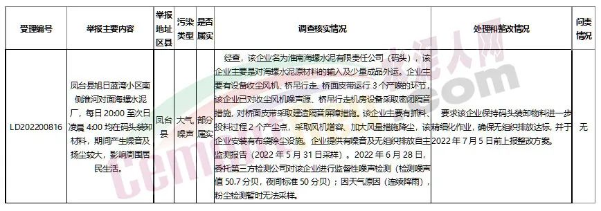 鳳臺縣旭日藍灣小區(qū)南側淮河對面海螺水泥廠,每日20:00至次日凌晨4:00均在碼頭裝卸材料,期間產(chǎn)生噪音及揚塵較大,影響周圍居民生活。