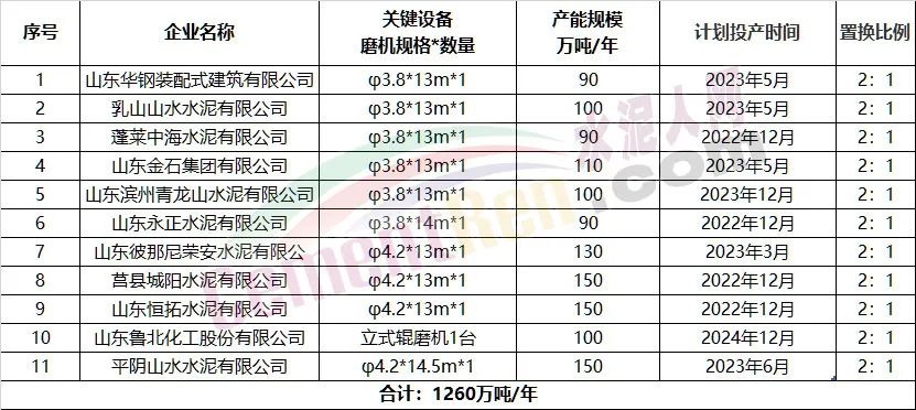 從11家企業(yè)產(chǎn)能置換情況表可見(jiàn), 擬建項(xiàng)目合計(jì)產(chǎn)能共1260萬(wàn)噸/年,產(chǎn)能置換比例均為2:1。關(guān)鍵設(shè)備、產(chǎn)能規(guī)模、投產(chǎn)日期分別為:φ3.8*13m共5臺(tái),產(chǎn)能規(guī)模從90~110萬(wàn)噸/年,投產(chǎn)日期從2022年12月~2023年12月;φ3.8*14m1臺(tái),年產(chǎn)能90萬(wàn)噸,投產(chǎn)日期2022年12月;φ4.2*13m共3臺(tái),產(chǎn)能規(guī)模130~150萬(wàn)噸/年,投產(chǎn)日期從2022年12~2023年6月;φ4.2*14.5m共1臺(tái),年產(chǎn)能150萬(wàn)噸,投產(chǎn)日期2023年6月;立式輥磨機(jī)1臺(tái),產(chǎn)能能100萬(wàn)噸,投產(chǎn)日期為2024年12月。詳情如下: