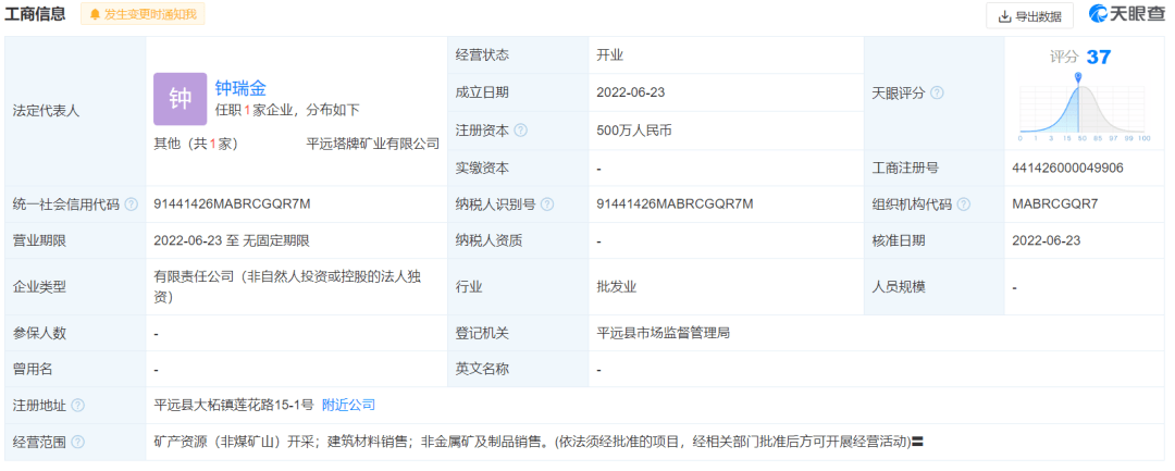 天眼查APP顯示,平遠(yuǎn)塔牌礦業(yè)有限公司,于2022年6月23日成立,注冊(cè)資本為500萬人民幣,法定代表人為鐘瑞金,經(jīng)營狀態(tài)為開業(yè),工商注冊(cè)號(hào)為441426000049906,注冊(cè)地址為平遠(yuǎn)縣大柘鎮(zhèn)蓮花路15-1號(hào),經(jīng)營范圍包括礦產(chǎn)資源(非煤礦山)開采;建筑材料銷售;非金屬礦及制品銷售。