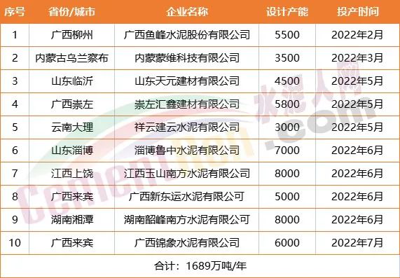 據(jù)水泥人網(wǎng)不完全統(tǒng)計(jì),今年內(nèi)共投產(chǎn)水泥熟料產(chǎn)線10條,合計(jì)熟料產(chǎn)能1689萬噸。僅廣西區(qū)域就有4條水泥熟料生產(chǎn)線,熟料產(chǎn)能合計(jì)達(dá)669萬噸/年。