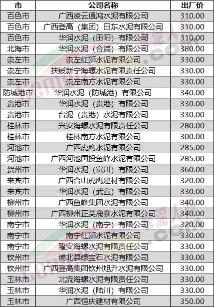廣西區(qū)域P.O42.5散裝水泥出廠參考價(jià)