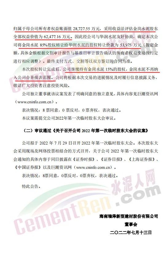 7月13日,海南瑞澤發(fā)布公告,鑒于公司全資子公司肇慶市金崗水泥有限公司(以下簡稱“金崗水泥”)產能規(guī)模偏小,自身無石灰石礦山等資源優(yōu)勢,水泥熟料生產成本偏高,水泥產品缺乏競爭優(yōu)勢,且未來公司將重點專注于環(huán)保生態(tài)產業(yè)、商品混凝土及裝配式建筑業(yè)務;同時為進一步調整公司債務結構,降低公司短期內流動性風險。因此,董事會同意公司將持有的金崗水泥85%的股權轉讓給華潤水泥投資有限公司。