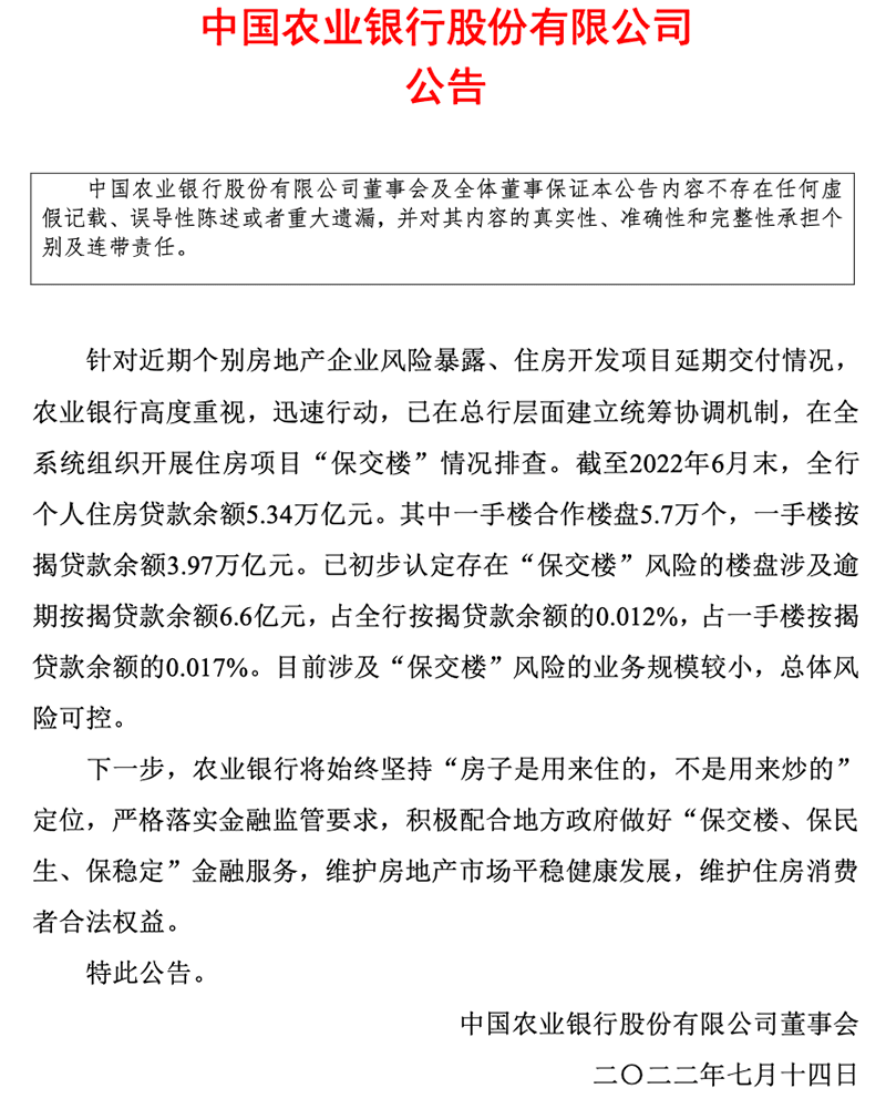 農(nóng)業(yè)銀行發(fā)布公告稱,針對近期個別房地產(chǎn)企業(yè)風(fēng)險暴露、住房開發(fā)項目延期交付情況,農(nóng)業(yè)銀行高度重視,迅速行動,已在總行層面建立統(tǒng)籌協(xié)調(diào)機制,在全系統(tǒng)組織開展住房項目“保交樓”情況排查。