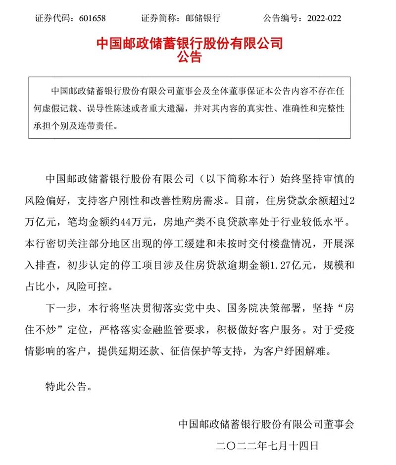 郵儲銀行公告稱,該行始終堅持審慎的風(fēng)險偏好,支持客戶剛性和改善性購房需求。目前,住房貸款余額超過2萬億元,筆均金額約44萬元,房地產(chǎn)類不良貸款率處于行業(yè)較低水平。該行密切關(guān)注部分地區(qū)出現(xiàn)的停工緩建和未按時交付樓盤情況,開展深入排查,初步認定的停工項目涉及住房貸款逾期金額1.27億元,規(guī)模和占比小,風(fēng)險可控。