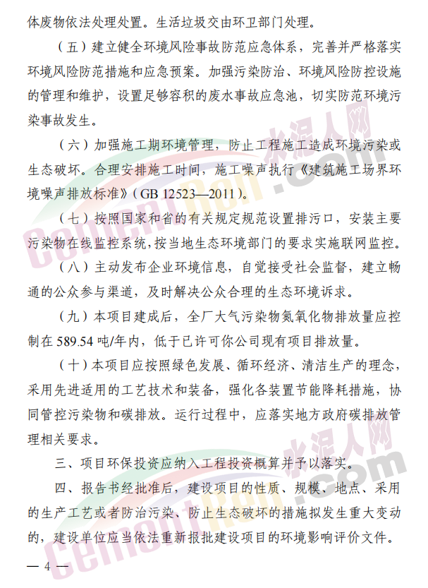 (一)嚴(yán)格落實(shí)大氣污染防治措施。項(xiàng)目各工序產(chǎn)生的廢氣應(yīng)有效收集處理,各排氣筒高度不低于報告書建議值。本項(xiàng)目水泥窯及窯尾余熱利用系統(tǒng)煙氣顆粒物、二氧化硫、氮氧化物排放濃度應(yīng)分別不高于 10 毫克/立方米、30 毫克/立方米、50 毫克/立方米。