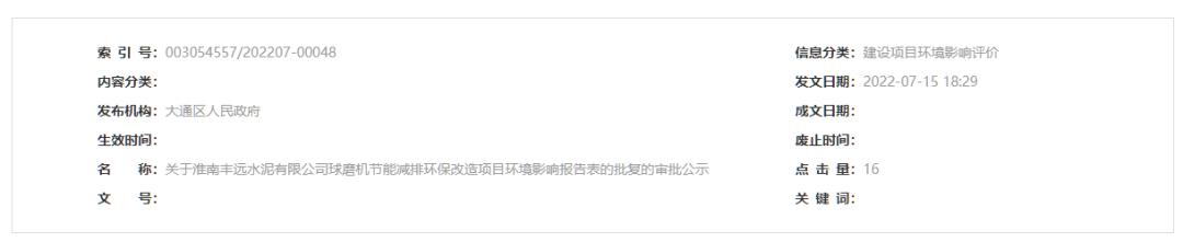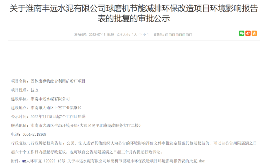日前,安徽省淮南市發(fā)布《關于淮南豐遠水泥有限公司球磨機節(jié)能減排環(huán)保改造項目環(huán)境影響報告表的批復》提到,項目位于淮南市大通區(qū)上窯工業(yè)集聚區(qū),項目總投資5000萬元,其中環(huán)保投資250萬元,占地面積約51837平方米。
