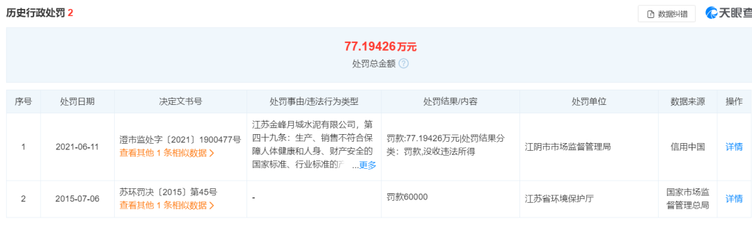 歷史行政處罰信息顯示,江陰市市場(chǎng)監(jiān)督管理局于2021年6月11日 對(duì)企業(yè)處以罰款:77.19426萬(wàn)元,處罰結(jié)果分類(lèi)為罰款,沒(méi)收違法所得。