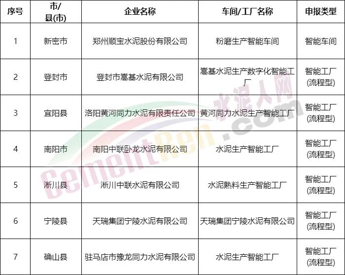 7月12日,河南省工信廳發(fā)布《2022年河南省智能車間智能工廠擬確定名單》公示,名單中包括洛陽黃河同力水泥有限責(zé)任公司、南陽中聯(lián)臥龍水泥有限公司、淅川中聯(lián)水泥有限公司、天瑞集團(tuán)寧陵水泥有限公司、駐馬店市豫龍同力水泥有限公司、鄭州順寶水泥股份有限公司、登封市嵩基水泥有限公司等七家水泥企業(yè)。