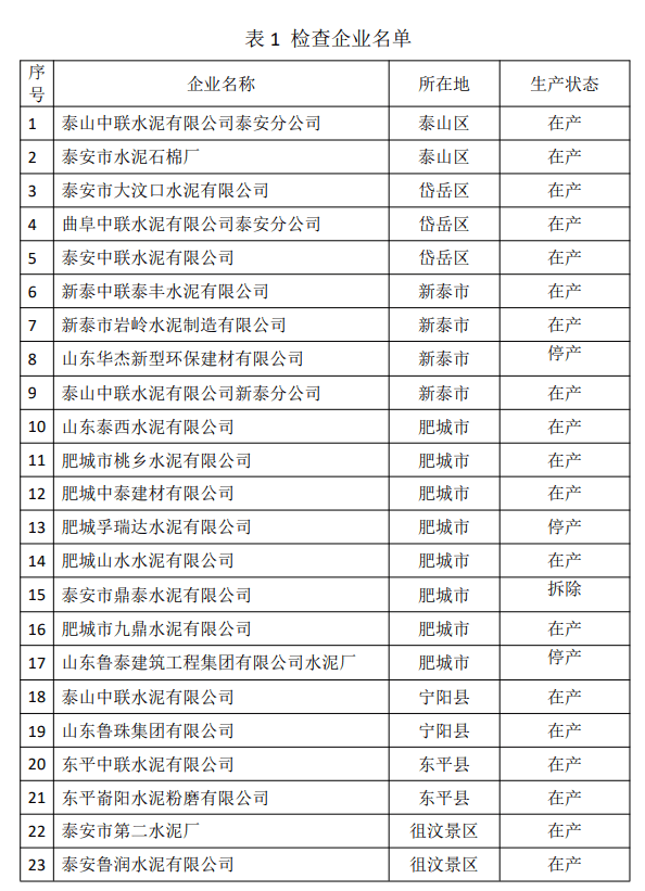 本次共檢查泰安市工業(yè)產(chǎn)品生產(chǎn)許可獲證水泥企業(yè)23家,從企業(yè)分布看泰山區(qū)2家,岱岳區(qū)3家,新泰市4家,肥城市8家,寧陽縣2家,東平縣2家,徂汶新區(qū)2家,其中有3家已停產(chǎn)。