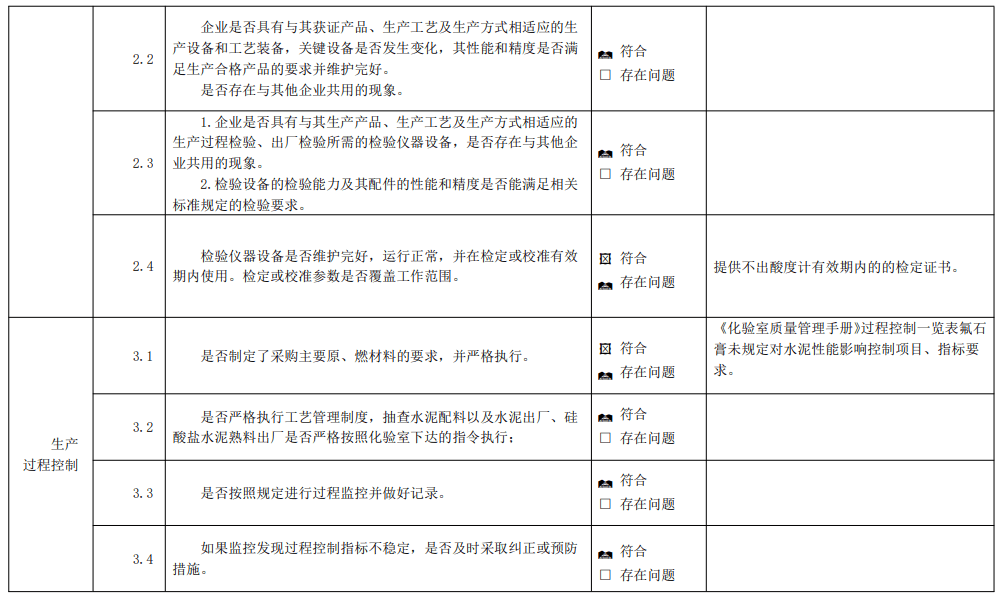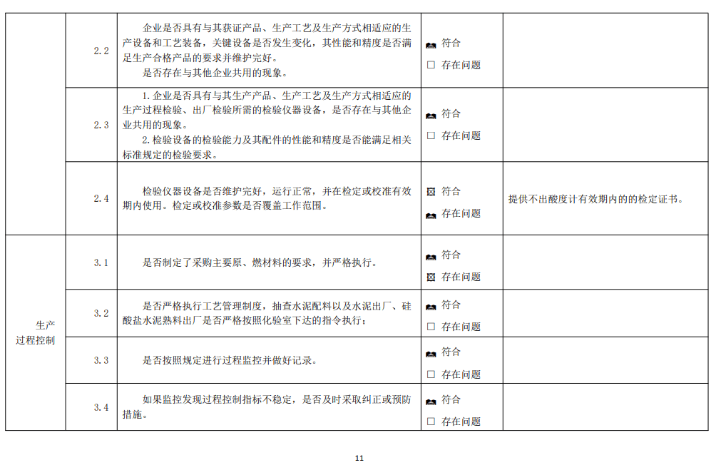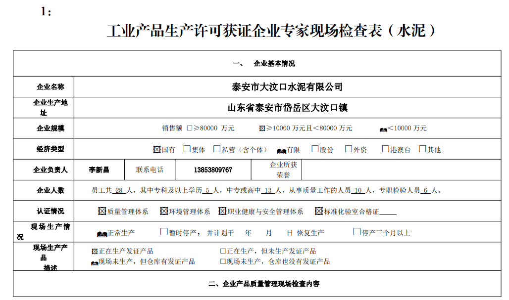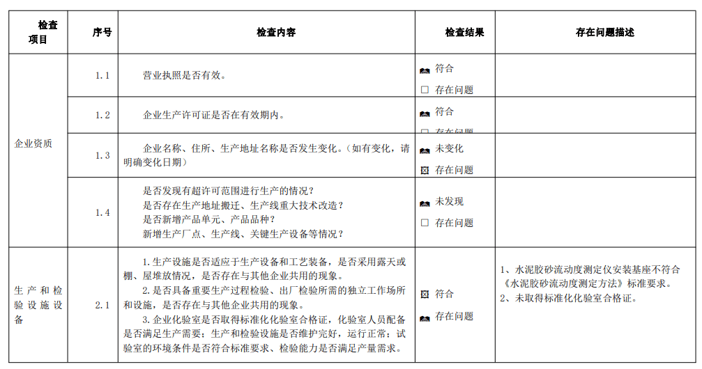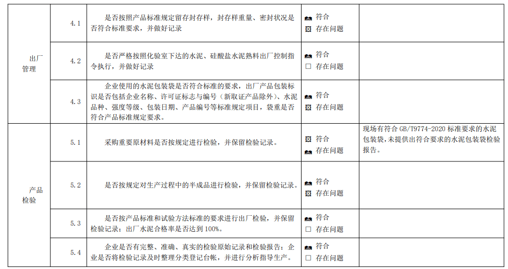 本次檢查為生產(chǎn)企業(yè)現(xiàn)場(chǎng)實(shí)地檢查,檢查范圍為泰安市工業(yè)產(chǎn)品生產(chǎn)許可獲證水泥企業(yè)(共計(jì)23家),檢查組由山東省建材工業(yè)協(xié)會(huì)的行業(yè)專家和市、區(qū)兩級(jí)市場(chǎng)監(jiān)管部門執(zhí)法人員組成,主要通過聽取企業(yè)匯報(bào)、查閱有關(guān)資料、詢問相關(guān)人員、巡視生產(chǎn)現(xiàn)場(chǎng)等形式,對(duì)獲證企業(yè)應(yīng)當(dāng)具備的資質(zhì)條件、質(zhì)量保證體系的建立和運(yùn)行情況、生產(chǎn)工藝、產(chǎn)品質(zhì)量控制以及企業(yè)落實(shí)產(chǎn)品質(zhì)量、生產(chǎn)許可等政策法規(guī)情況進(jìn)行檢查。檢查結(jié)束后,當(dāng)場(chǎng)反饋檢查結(jié)果,提出整改意見和建議,并組織檢查人員、企業(yè)負(fù)責(zé)人及當(dāng)?shù)乇O(jiān)管部門工作人員共同對(duì)檢查結(jié)果簽字確認(rèn)。