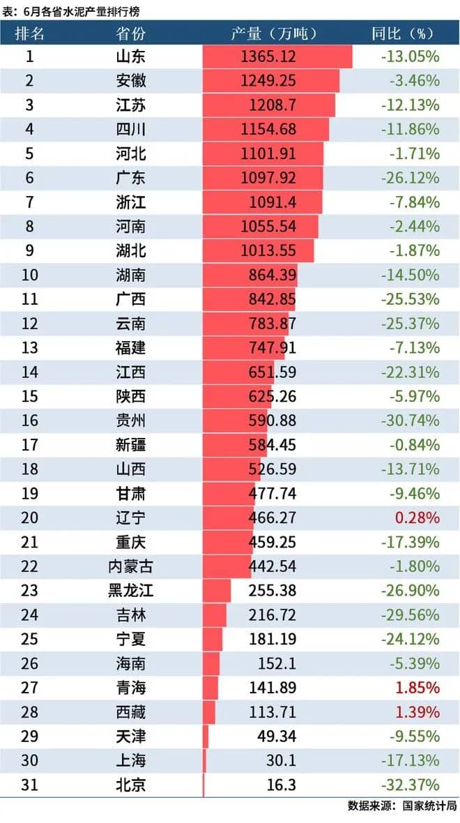 據(jù)國(guó)家統(tǒng)計(jì)局公布的數(shù)據(jù)顯示,6月水泥產(chǎn)量為1.96億噸,同比減少12.9%。1-6月累計(jì)水泥產(chǎn)量為9.77億噸,同比下降15%。