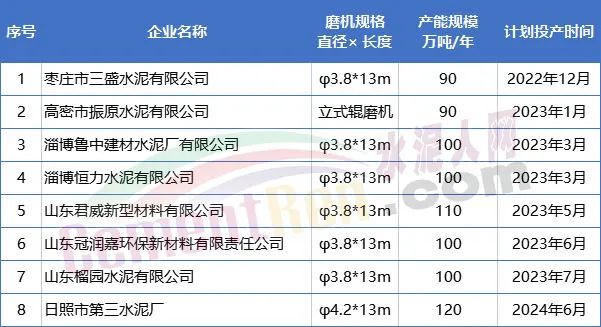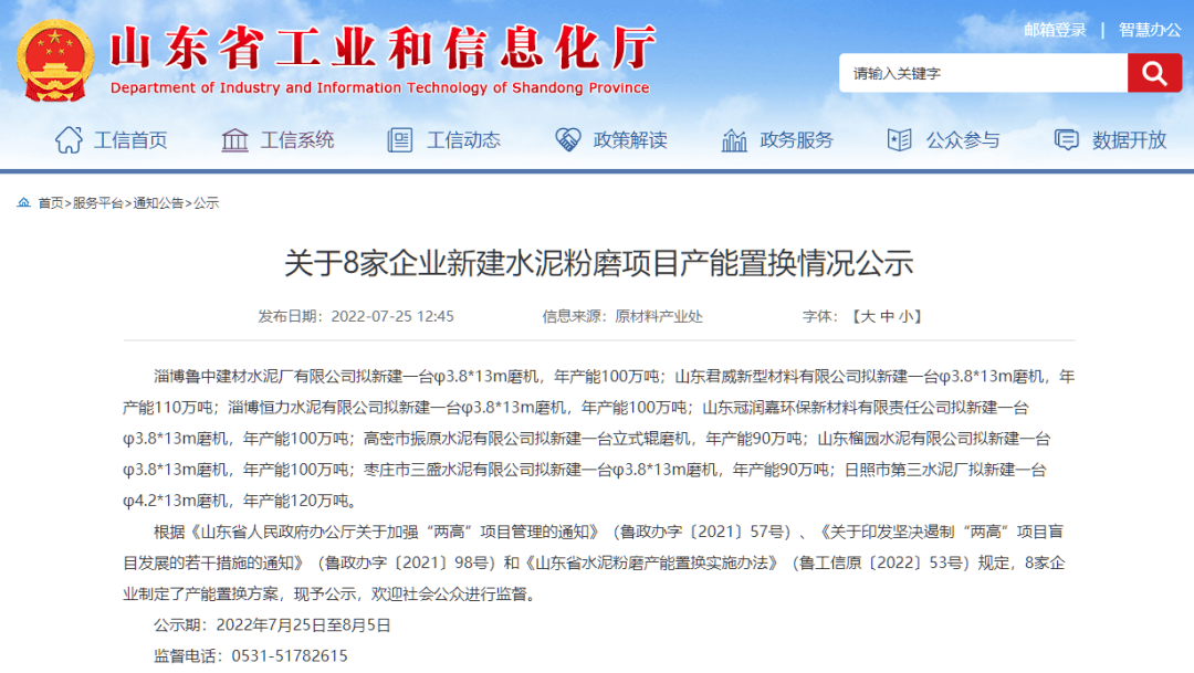 日前,山東省工信廳發(fā)布《關(guān)于8家企業(yè)新建水泥粉磨項(xiàng)目產(chǎn)能置換情況公示》稱,根據(jù)相關(guān)文件規(guī)定,8家企業(yè)制定了產(chǎn)能置換方案。置換比例全部為2:1,新建線產(chǎn)能規(guī)模為90~120萬(wàn)噸/年,擬投產(chǎn)日期從2022年12月至2024年6月,合計(jì)產(chǎn)能達(dá)810萬(wàn)噸/年,詳情如下: