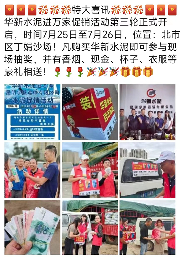 據(jù)市場反饋,近來云南昆明區(qū)域主要品牌企業(yè)發(fā)起了夏季促銷活動。一次訂購5噸水泥,送20袋石粉,一次訂購10噸水泥,送云煙一條。