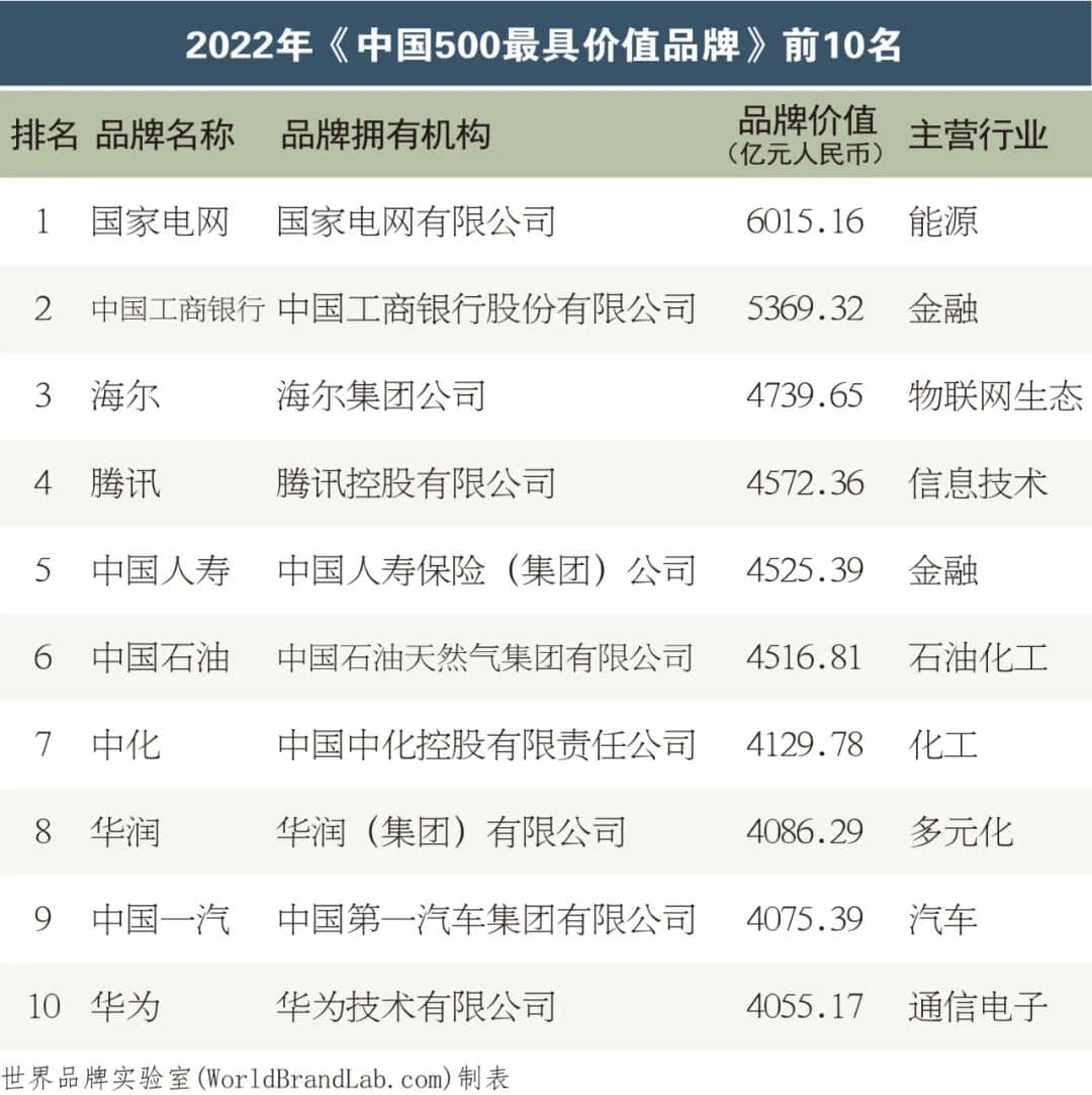 由世界品牌實驗室(World Brand Lab)主辦的(第十九屆)“世界品牌大會”于7月26日在北京舉行,會上發(fā)布了2022年《中國500最具價值品牌》分析報告。在這份基于財務(wù)數(shù)據(jù)、品牌強度和消費者行為分析的年度報告中,國家電網(wǎng)以6015.16億元的品牌價值榮登本年度最具價值品牌榜首。占據(jù)榜單前五名的還有中國工商銀行(5369.32億元)、海爾(4739.65億元)、騰訊(4572.36億元)、中國人壽(4525.39億元),這些品牌已經(jīng)邁進世界級品牌陣營。來自哈佛、耶魯、牛津、歐洲工商管理學院、倫敦大學學院的管理大師們出席了“世界品牌大會”并做在線演講,圍繞“氣與勢:如何重建品牌生態(tài)系統(tǒng)”的大會主題與現(xiàn)場嘉賓互動研討。