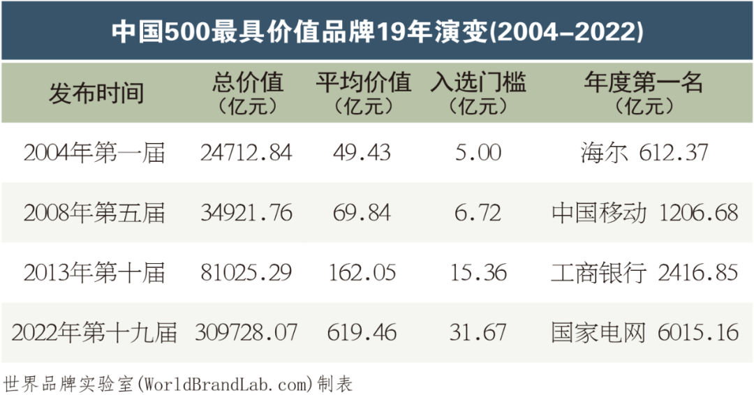 2022年《中國500最具價值品牌》的總價值為309728.07億元,比去年增加30774.87億元,增加幅度為11.03%。世界品牌實驗室學術(shù)委員會主席、牛津大學(Oxford)營銷學榮譽教授斯蒂芬·沃格(Steve Woolgar)表示:“品牌是一個國家的形象,我希望世界上更多的人能夠通過中國品牌了解中國的故事。在過去的17年中,我目睹了中國品牌的快速成長,有的已經(jīng)具有強大的世界影響力”。世界品牌實驗室編制中國品牌報告已是第19個年頭,2004年入選門檻僅為5億元,前500名品牌的平均價值為49.43億元。19年以后的2022年,入選門檻已經(jīng)提高到31.67億元,而前500名品牌的平均價值高達619.46億元,增加幅度為1153.21%。