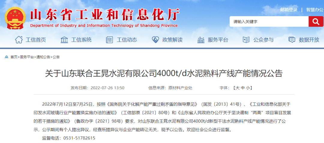 日前,山東工信廳發(fā)布公告稱,按照相關文件要求,對山東聯合王晁水泥有限公司4000t/d新型干法水泥