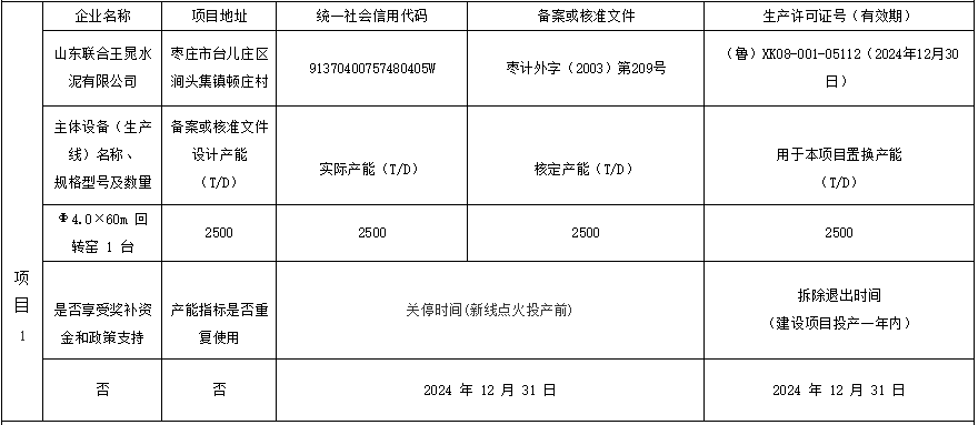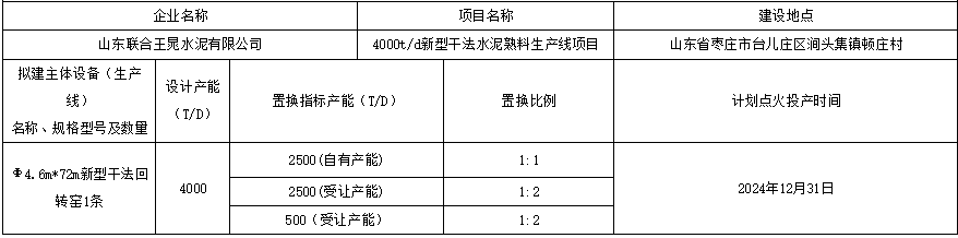 熟料產線產能情況進行公告。項目通過拆除山東聯合王晁水泥有限公司自有2500t/d以及龍口市泛林水泥有限公司2500t/d和泰安魯潤水泥有限公司1000t/d熟料生產線新建一條4000t/d熟料生產線,建設地址位于山東省棗莊市臺兒莊區(qū)澗頭集鎮(zhèn)頓莊村。擬建主體將采用Φ4.6m*72m