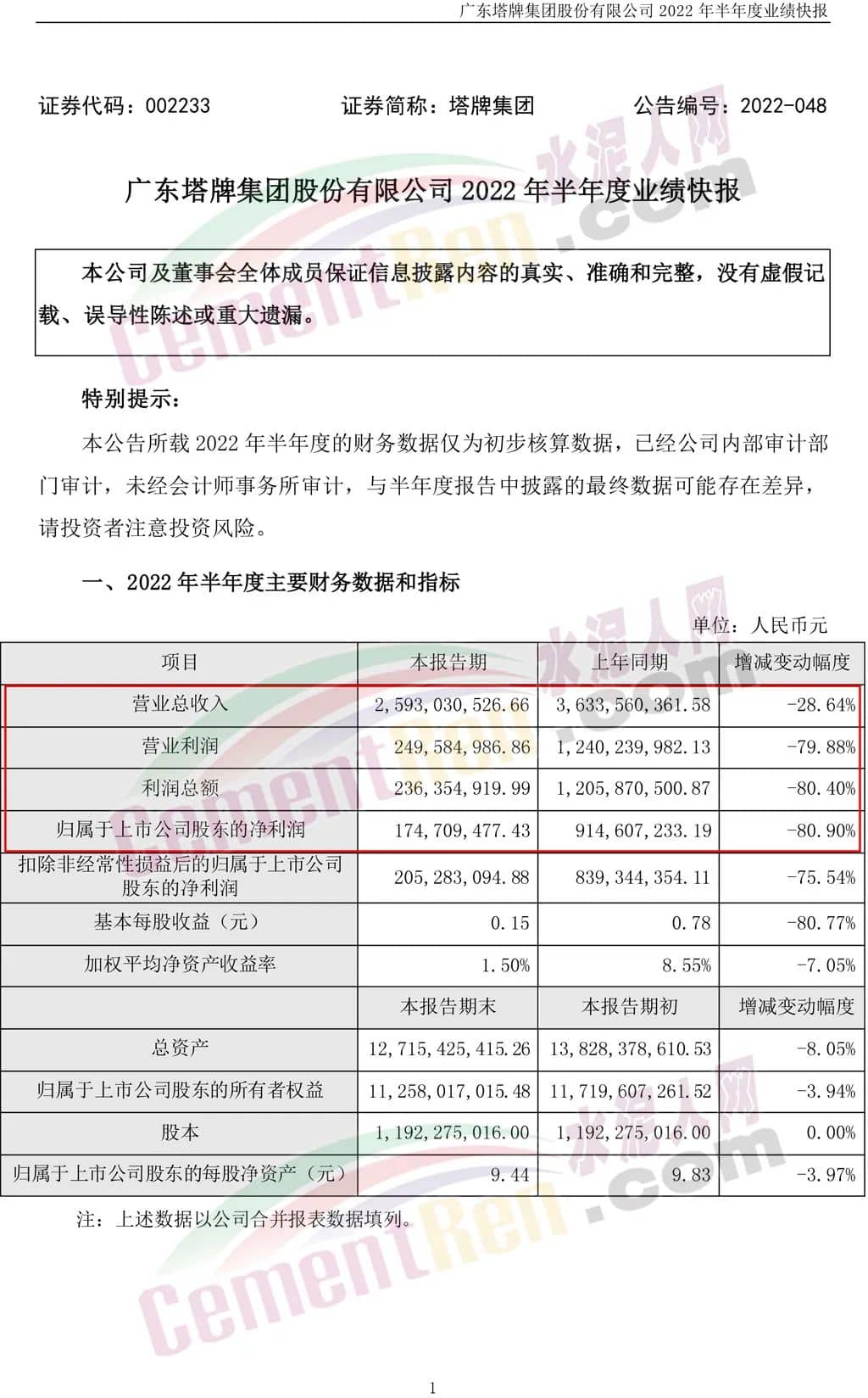 塔牌集團(tuán)(002233)7月28日晚間發(fā)布業(yè)績(jī)快報(bào),2022年半年度營(yíng)業(yè)收入為25.93億元,同比下滑28.64%;歸母凈利潤(rùn)1.75億元,同比下滑80.9%;基本每股收益0.15元。