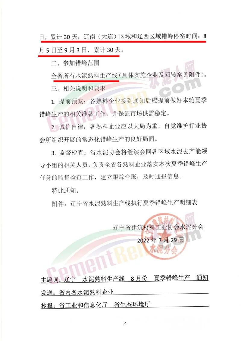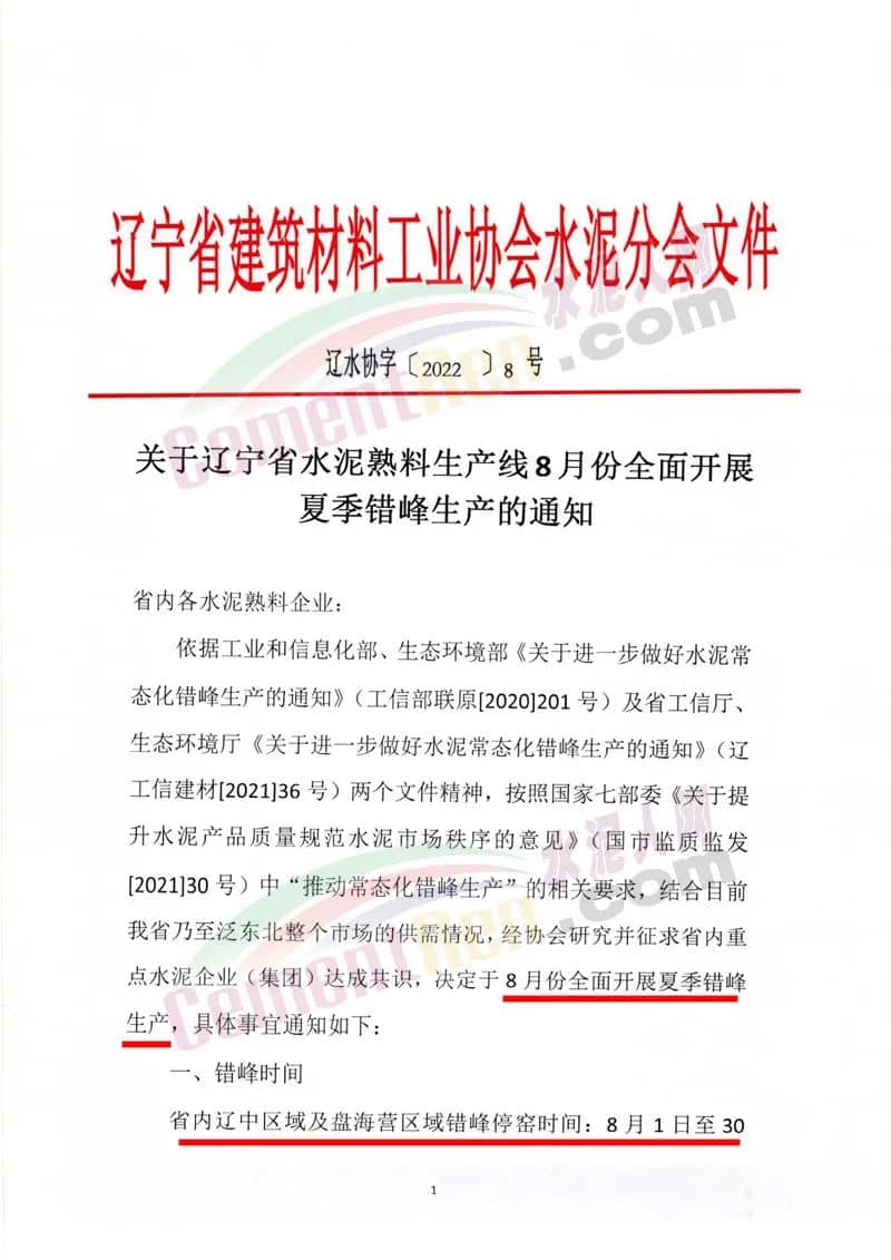 日前,遼寧省建筑材料工業(yè)協(xié)會(huì)水泥分會(huì)發(fā)布《關(guān)于遼寧省水泥熟料生產(chǎn)線8月份全面開展夏季錯(cuò)峰生產(chǎn)的通知》給省內(nèi)各水泥熟料企業(yè)稱,依據(jù)相關(guān)文件要求,結(jié)合目前遼寧省乃至泛東北整個(gè)市場(chǎng)的供需情況,經(jīng)協(xié)會(huì)研究并征求省內(nèi)重點(diǎn)水泥企業(yè)(集團(tuán))達(dá)成共識(shí),決定全省所有水泥熟料生產(chǎn)線8月份全面開展夏季錯(cuò)峰生產(chǎn)。遼中區(qū)域及盤海營區(qū)域錯(cuò)峰停窯時(shí)間:8月1日至30日,累計(jì)30天;遼南(大連)區(qū)域和遼西區(qū)域錯(cuò)峰停窯時(shí)間:8月5日至9月3日,累計(jì)30天。