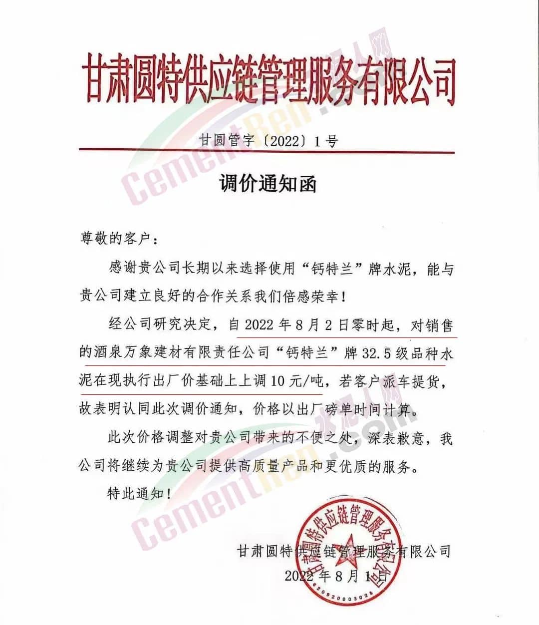 水泥人網(wǎng)通訊員消息:日前,甘肅圓特供應(yīng)鏈管理服務(wù)有限公司通知,自8月2日零時(shí)起,對(duì)銷售的酒泉萬(wàn)象建材有限公司“鈣特蘭”牌32.5級(jí)品種水泥在現(xiàn)執(zhí)行出廠價(jià)基礎(chǔ)上上調(diào)10元/噸。