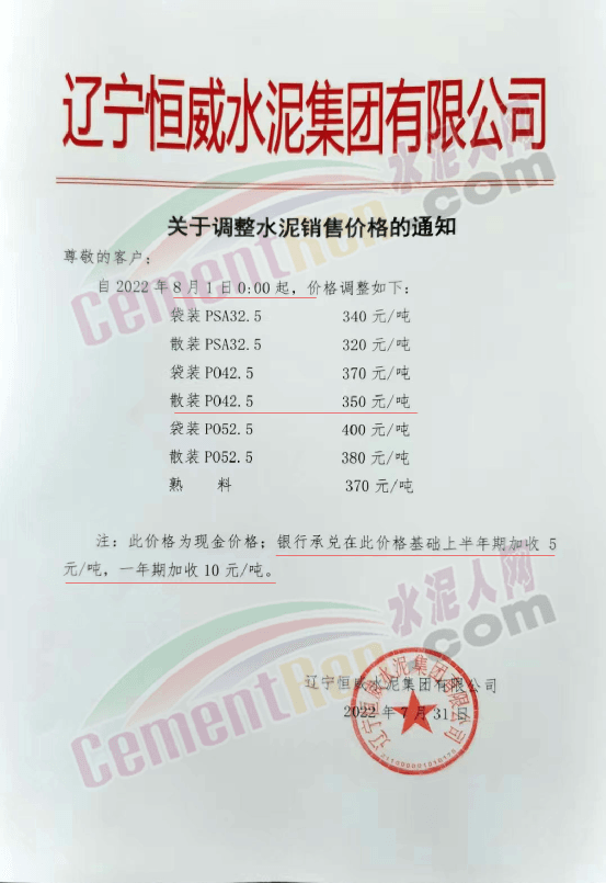 遼寧恒威水泥集團(tuán)有限公司通知,自8月1日起調(diào)整水泥報(bào)價(jià),調(diào)整后P.O42.5散裝水泥報(bào)350元/噸。