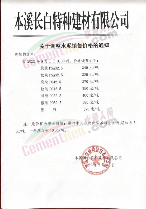 臺(tái)泥(遼寧)水泥有限公司通知稱,自8月1日8時(shí)起對(duì)產(chǎn)品銷售價(jià)格進(jìn)行調(diào)整,調(diào)整后P.O42.5散裝水泥報(bào)價(jià)350元/噸。