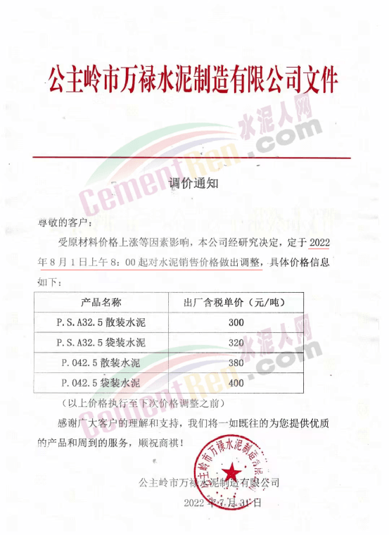公主嶺市萬(wàn)祿水泥制造有限公司通知自8月1日上午8時(shí)起對(duì)水泥銷售價(jià)格做出調(diào)整。調(diào)整后P.O42.5散裝水泥報(bào)價(jià)380元/噸。